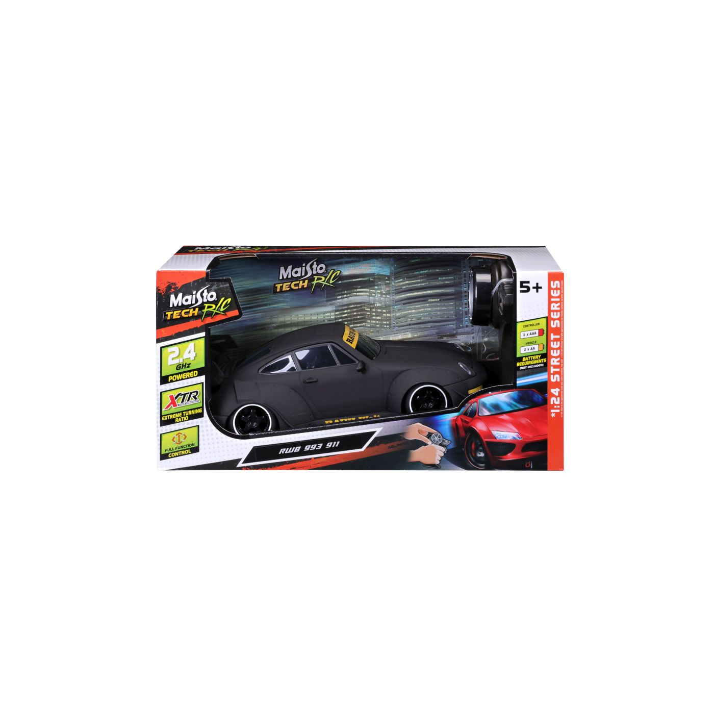 Admira stilul unic si agresiv cu RWB 993 911, o masinuta RC premium la scara 1:24 din seria Street Series! Acest Porsche 911 clasic, modificat de RWB, iese in evidenta prin caroseria sa widebody spectaculoasa, aripile proeminente si detaliile personalizate. Culoarea neagra mata ii confera un aspect impunator si misterios. Bucura-te de control precis si manevrabilitate superioara datorita tehnologiei 2.4GHz si a XTR (Extreme Turning Ratio). Aceasta functie speciala iti permite sa virezi cu un unghi mai mare, oferind o agilitate sporita in curbe. Ai control complet al functiilor: inainte, inapoi, stanga si dreapta. Vehiculul necesita 2 baterii AA (nu sunt incluse) pentru a functiona. Controllerul necesita 2 baterii AAA (nu sunt incluse). Asigura-te ca ai bateriile potrivite pentru a te bucura de experienta completa! Setul este prezentat intr-o cutie atractiva, perfecta pentru a vedea detaliile unice ale acestei masini modificate inainte de a o achizitiona. Pregateste-te sa iesi in evidenta cu stil si atitudine cu RWB 993 911!
