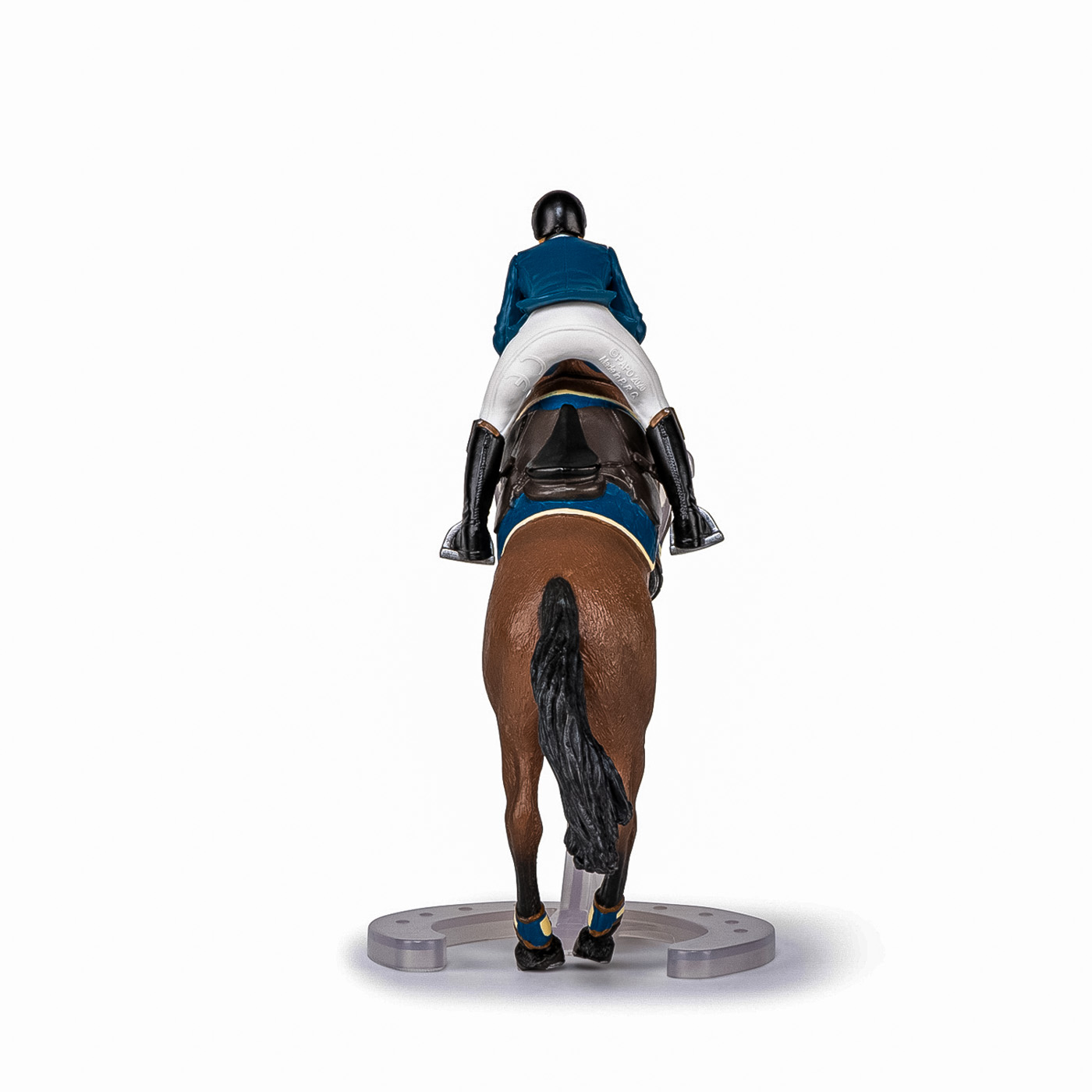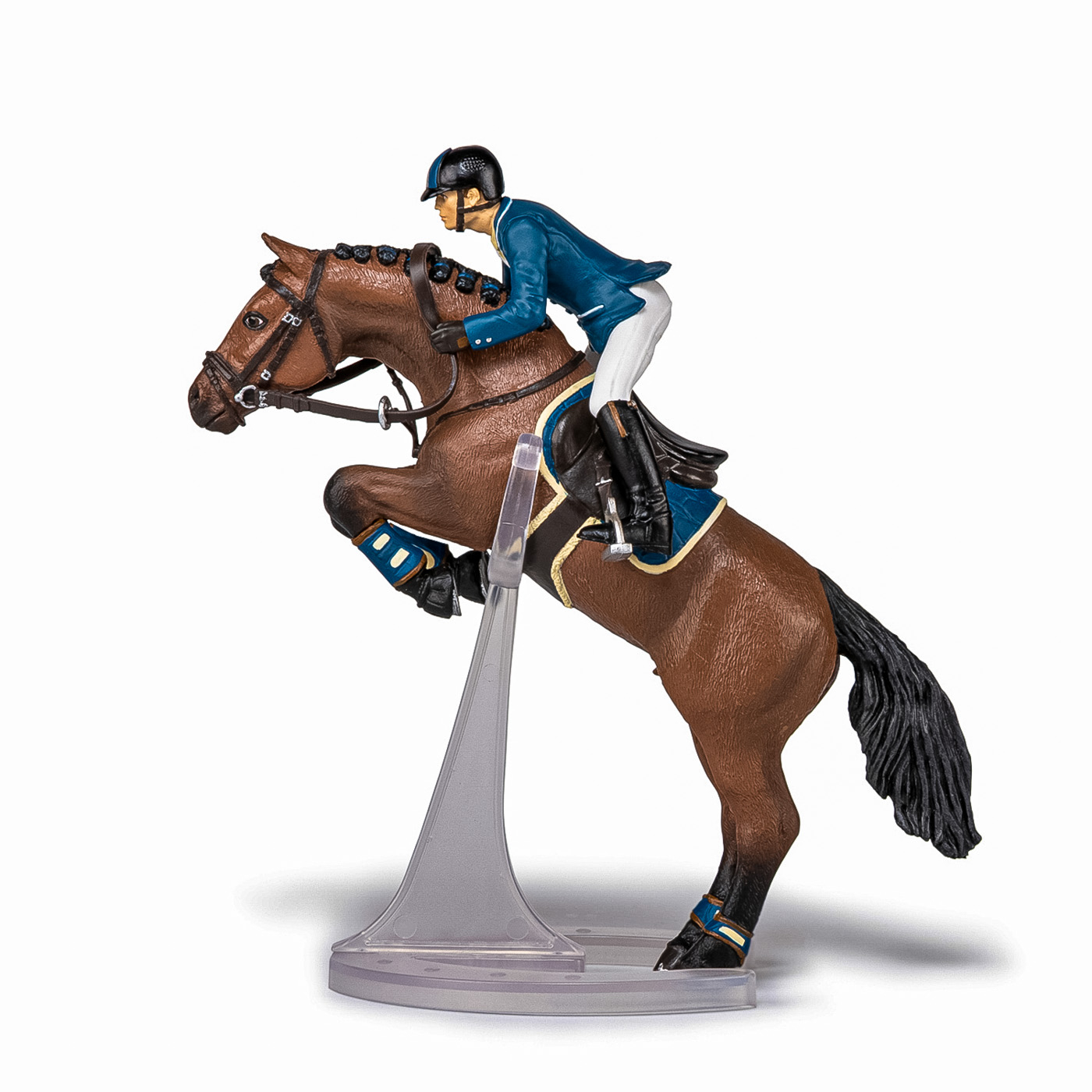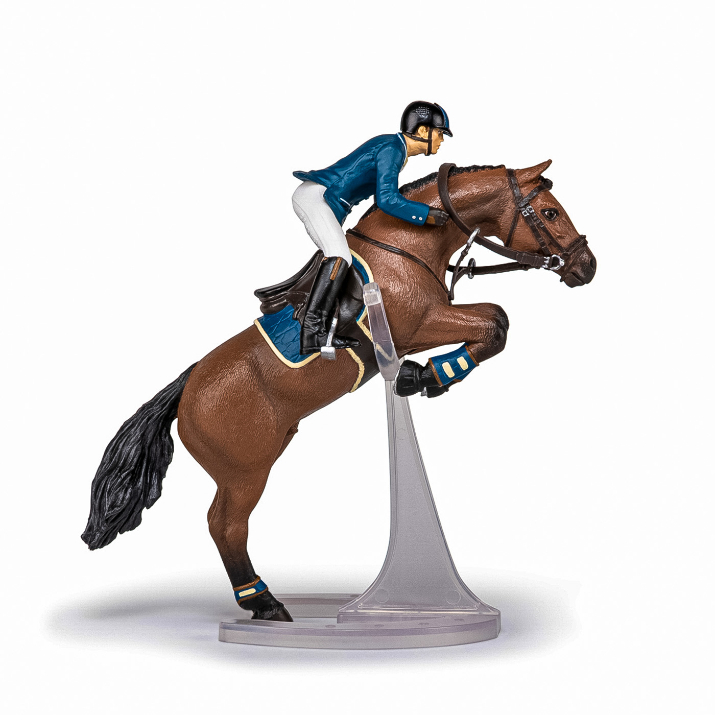 Faceti o plimbare prin campuri cu ecvinele Papo, participati la concursuri de sarituri sau chiar la cursuri de dresaj. Tensiunea este la maxim pe traseul de sarituri, tanarul calaret insotita de calul ei se pregateste sa treaca de ultimul obstacol care ii desparte de victorie. Regula este simpla, pentru a castiga este necesar ca impreuna sa o treaca fara sa o rastoarne. Produsul are urmatoarele dimensiuni: 16 x 10 x 19cm si este recomandat copiilor cu varsta peste 3 ani. De mai bine de 20 de ani, Papo inoveaza constant si ii face pe copii din intreaga lume sa viseze cu o gama bogata de peste 600 de produse, reprezentand 12 lumi, animale si personaje. De la modelul original la serie, fiecare dintre figurinele Papo a fost conceputa si creata in Franta pentru a fi fabricata intr-o permanenta preocupare pentru calitate. Pictate manual, atentia la detalii este acum recunoscuta. Figurinele Papo se disting prin acuratete si realism, detaliile sunt de asa natura incat am putea crede ca se vor pune in miscare.