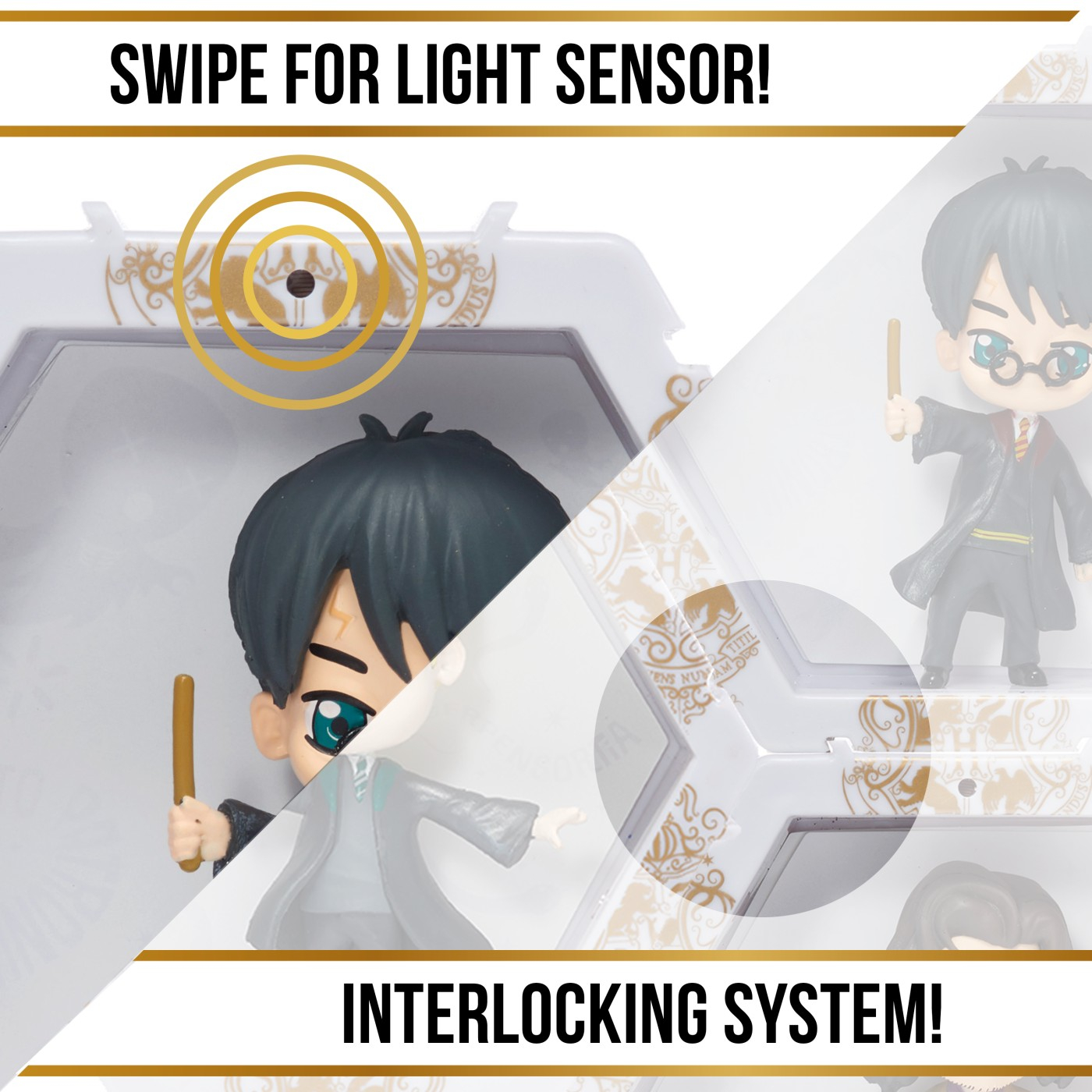 Fiecare personaj este situat in propriul POD in forma de hexagon cu lumini UV si senzor IR incorporat. Pur si simplu miscati mana peste senzor pentru a lumina WOW-ul! POD-ul! Misca-ti mana in fata POD-ului pentru a-l lumina si a dezvalui pictograme ascunse in spatele WOW!Pod-ului! Lumina se stinge automat dupa 30 de secunde. Conectati-le in cateva secunde! Colectia ta poate lua diferite forme si avea in fiecare zi, alt look! Limita e doar de imaginatia ta! Puteti chiar sa va scrieti numele sau initialele pentru a crea un afisaj care este fara indoiala si unic al dvs.! Colectionati si conectati personajele favorite printr-o colectie mai vasta de eroi WOW! PODS! Sunt disponibile personaje : Marvel, DC, Disney, Disney Frozen, Sonic, Jurassic World, Harry Potter, Minionii si altele. Acest pachet contine personajul Harry Potter.