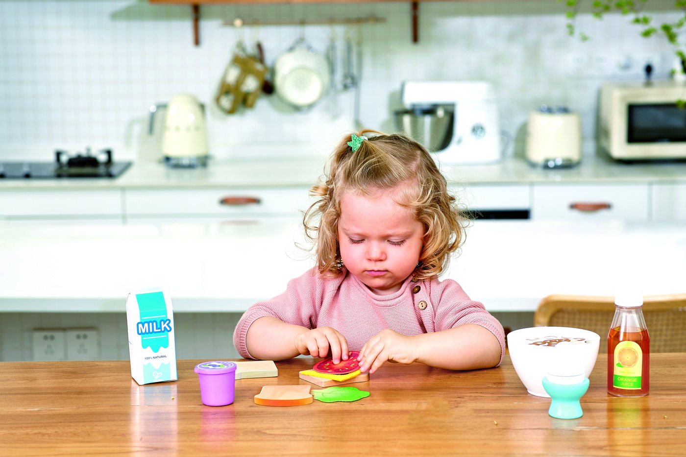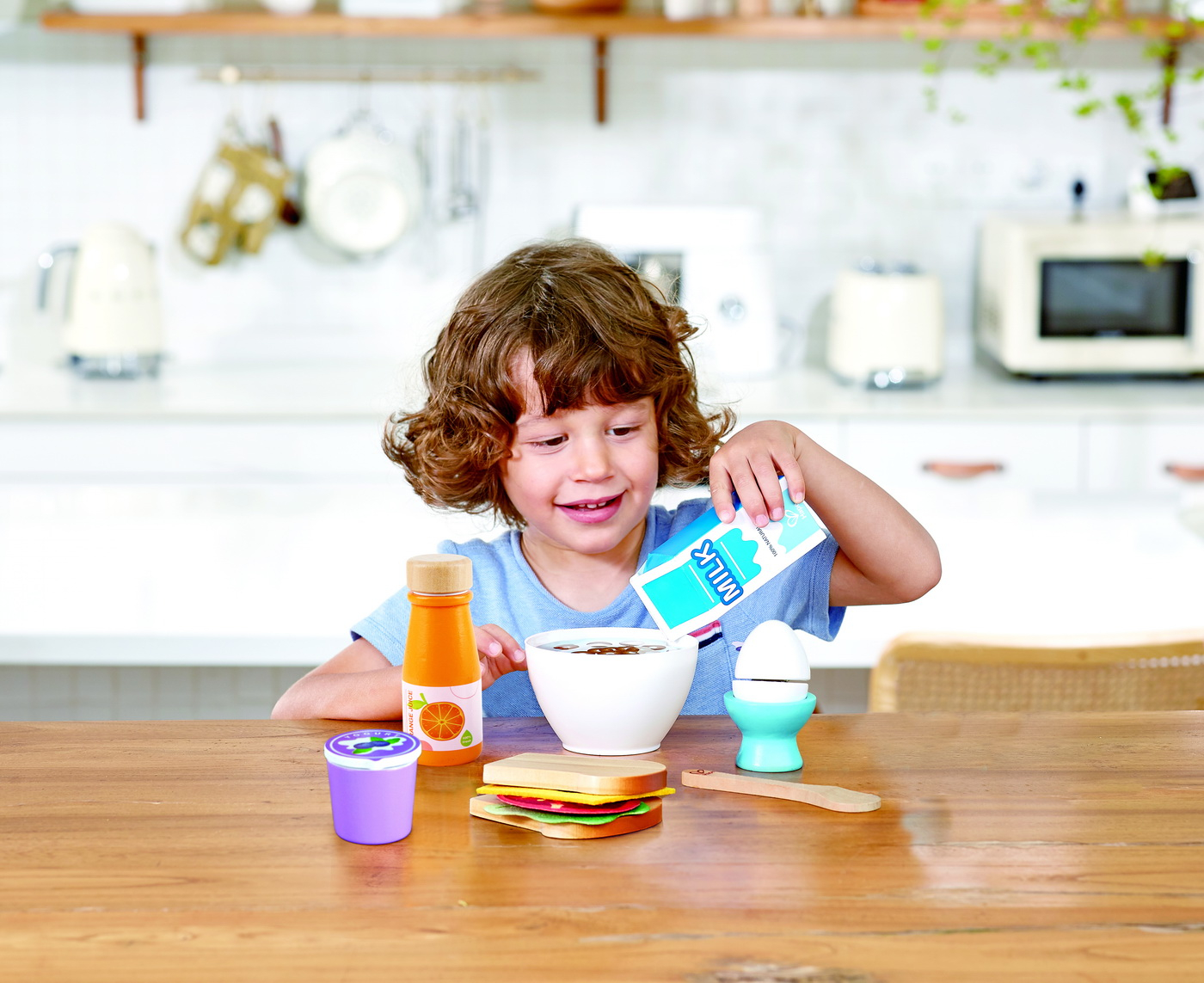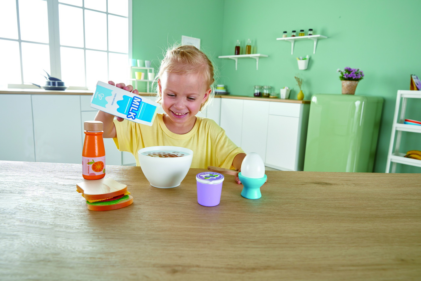 Pregateste-te pentru cea mai importanta masa a zilei cu acest set de mic dejun distractiv. Include iaurt cu capac de deschidere, lapte si o sticla de suc de portocale care face clic atunci cand intoarceti capacul. Include, de asemenea, un ou cu cupa de oua, un castron cu fulgi de ovaz cu o lingura, doua felii de paine prajita si cate o felie de rosii, salata si branza. Aveti un mic dejun sanatos cu acest set minunat! Faina de ovaz va va oferi multa energie pentru zi, laptele si iaurtul sunt bune pentru oase, iar oul, sucul de Marginile rotunde netede sunt perfecte pentru degetele mici de prins si de jucat. Jucariile sunt realizate din lemn, folosind materiale ecologice, vopsite in culori atragatoare cu vopsele nontoxice, care depasesc cele mai inalte si stricte standarde internationale de siguranta si calitate, precum EN71, ISO9001, ASTM F963 si altele. De multi ani, Hape a creat jucarii fantastice, de inalta calitate, folosind materiale ecologice si durabile, fiecare produs fiind atent proiectat pentru a stimula abilitatile senzoriale, fizice si emotionale.
