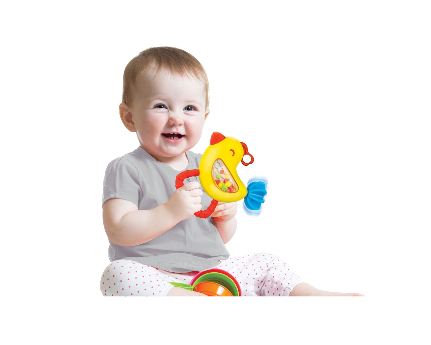 Zornaitoarea in forma de pasare este un companion perfect pentru bebelusi, fiind conceputa pentru a stimula simturile si a incuraja dezvoltarea motorie. Aceasta jucarie colorata si luminoasa atrage imediat atentia celor mici. Cu o coada care se invarte si un maner usor de prins, zornaitoarea este ideala pentru mainile mici ale bebelusilor. La fiecare agitare, jucaria emite sunete care ajuta la dezvoltarea simtului auditiv al copiilor. Designul ergonomic al manerului face jucaria usor de tinut si de manipulat, incurajand astfel dezvoltarea coordonarii ochi-mana si a abilitatilor motorii fine. Coada rotativa a pasarii adauga un element suplimentar de distractie, oferind copiilor sansa de a explora si descoperi prin joaca. Recomandata pentru bebelusi incepand cu varsta de 3 luni, aceasta zornaitoare in forma de pasare contribuie la dezvoltarea armonioasa a copiilor prin stimulare senzoriala si joc activ. Jucaria poate deveni rapid una dintre preferatele micutilor datorita designului sau atractiv si functionalitatilor diverse. Este perfecta pentru a fi introdusa in rutina zilnica a bebelusilor, oferindu-le ocazia de a descoperi noi sunete si texturi intr-un mod interactiv si sigur. O alegere ideala pentru orice parinte care doreste sa ofere copilului sau un inceput plin de culoare si veselie in explorarea lumii inconjuratoare.