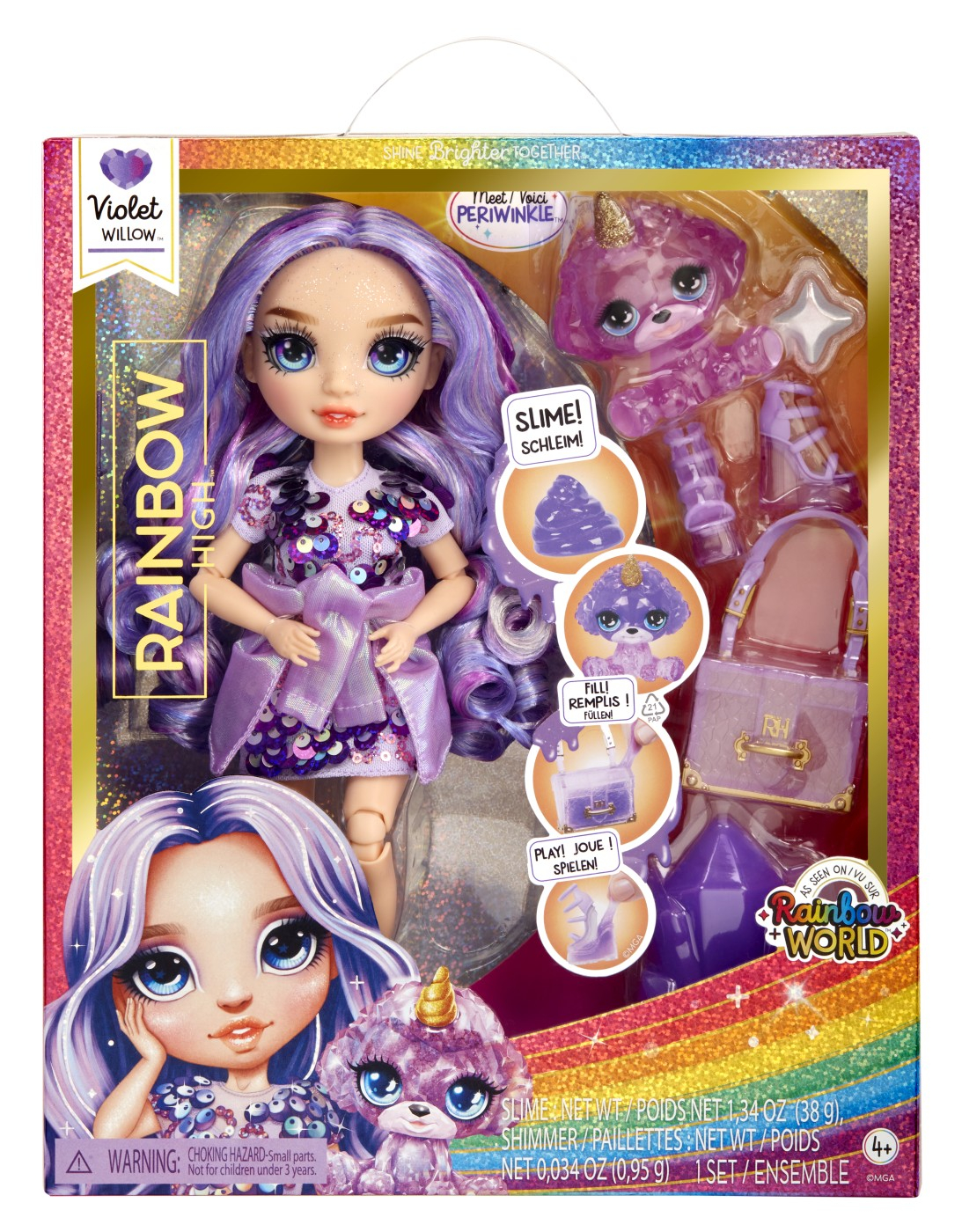 Rainbow High inspira copiii sa fie creativi. Curcubeul straluceste puternic, la fel si noile papusi Classic Rainbow! Descopera si joaca-te cu Violet Willow intr-un nou mod fantastic! Acum, cu Liquid Rainbow Slime exista mai multa culoare, mai multa stralucire, mai multe modalitati de joaca! Si, pentru prima data, papusa ta preferata vine cu propriul animal de companie, care, de asemenea, straluceste! Violet Willow este articulata pentru scenarii de joaca nelimitate si pline de farmec! Vine cu o tinuta completa inclusa si accesorii. Violet este imbracata din cap pana in picioare in mov! Pentru prima data, Violet are adorabilul ei animal de companie magic cu corn - Periwrinkle. Pentru a schimba culoarea animalutului, ii poti umple corpul cu slime. Violet Willow vine cu pantofi draguti si o geanta pe care le poti personaliza si carora le poti schimba culoarea adaugand niste slime. Are trasaturi superbe si detaliate si par frumos! Include: o papusa cu tinuta completa, pantofi, geanta, animal de companie, slime si sclipici. Colectioneaza toate papusile Rainbow High din gama Classic Rainbow si vei avea toate culorile curcubeului! Fiecare papusa are propriul stil care ii exprima perfect personalitatea. De asemenea, fiecare papusa vine cu culoarea de slime asortata: rosu, portocaliu, galben, verde, albastru, violet sau roz. Exista o multime de moduri de a-ti imagina o joaca distractiva si creativa cu aceste papusi! Imbraca-le in fiecare look, iar daca ai doua sau mai multe papusi din gama Classic Rainbow le poti schimba si asorta piesele vestimentare intre ele!